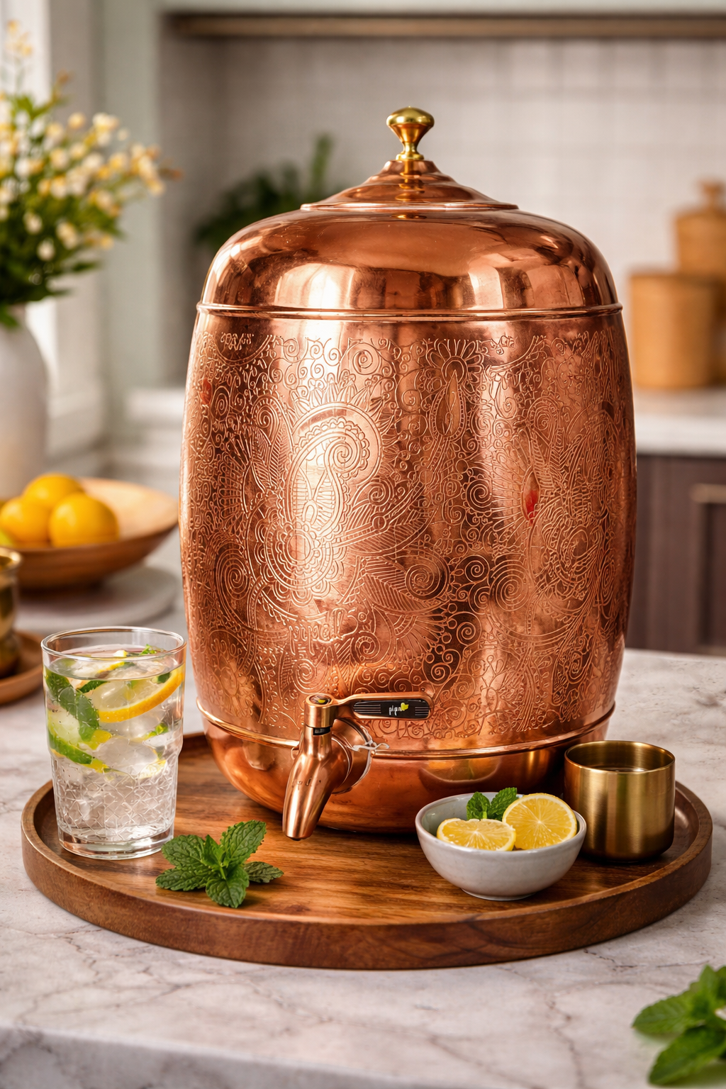 Copper water stored overnight helps maintain the water?s natural freshness and supports digestion, immunity, and metabolism. This matka is ideal for homes seeking a chemical-free, eco-friendly, and sustainable water storage solution.