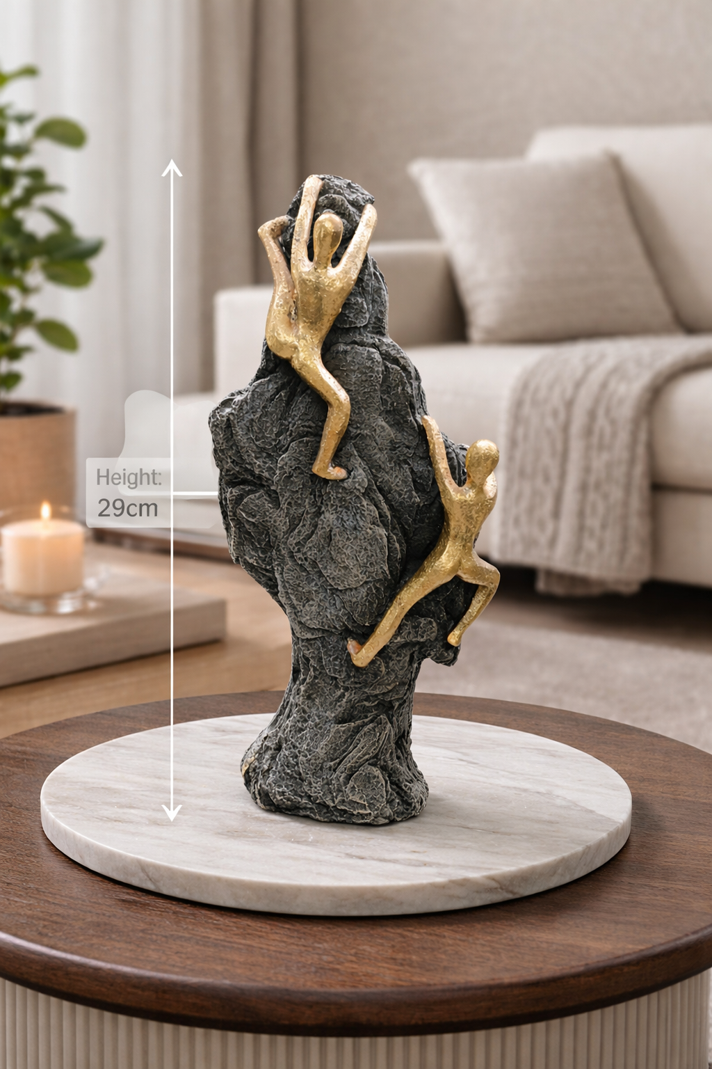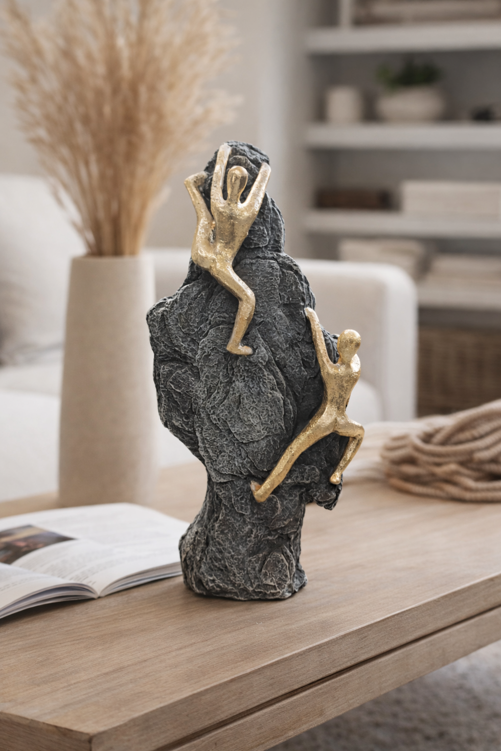The textured dark rock structure paired with elegant gold-toned climbers creates a striking artistic contrast, making this sculpture a meaningful statement piece for modern interiors. Its dynamic composition reflects movement and progress, serving as a daily reminder that every achievement begins with the courage to climb.