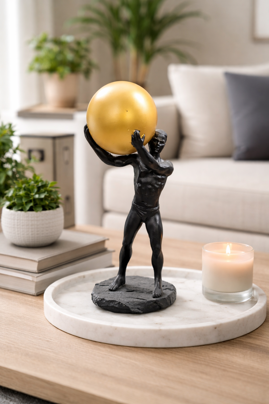 Add a touch of artistic elegance and modern sophistication to your living space with this striking decorative figurine. Featuring a sculpted human form finished in a sleek matte black tone, the statue gracefully holds a radiant golden sphere, symbolizing strength, balance, and achievement. The contrast between the bold black figure and the metallic gold globe creates a luxurious visual appeal that instantly elevates any d?cor setting.