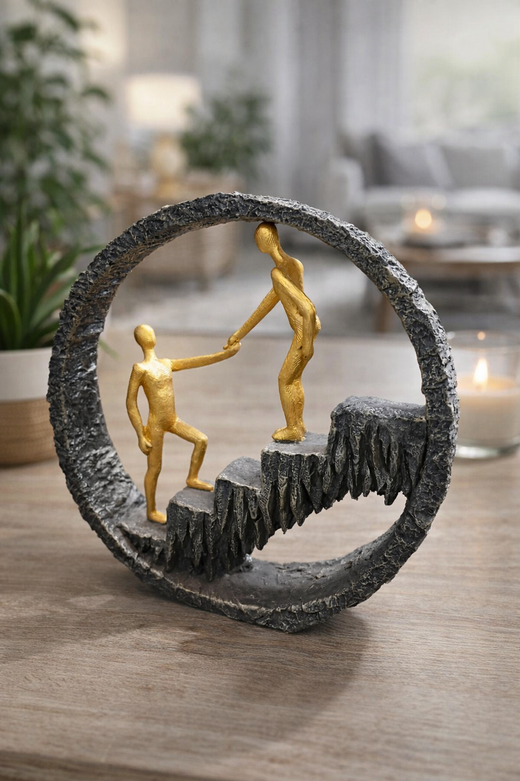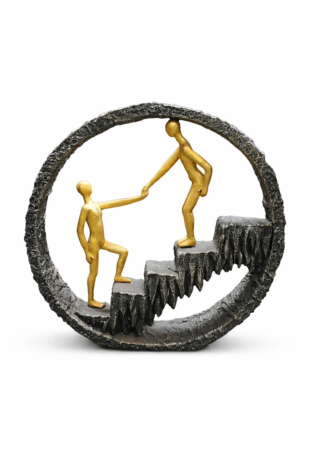 Symbolizing support, teamwork, and shared success, the Together We Rise Inspirational Circle Sculpture is a meaningful d?cor piece that celebrates the power of helping one another grow. The design features two abstract golden figures on a staircase, with one extending a helping hand to lift the other upward ? beautifully representing encouragement, leadership, and unity.