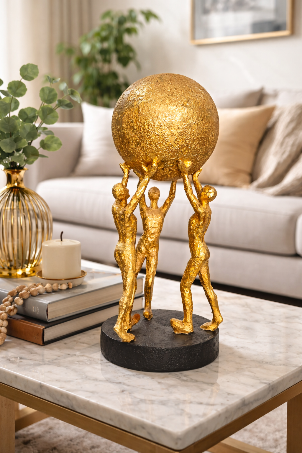 Elegant gold-tone figures with textured globe accent